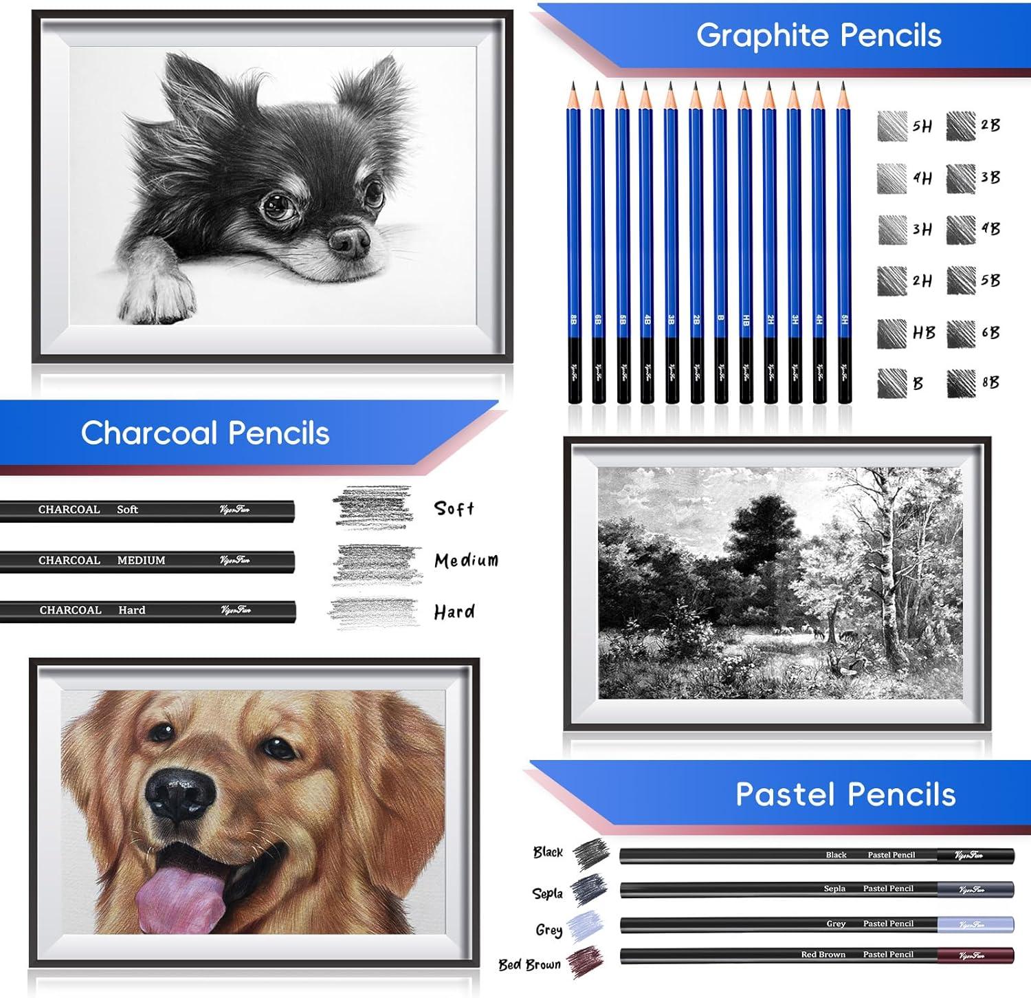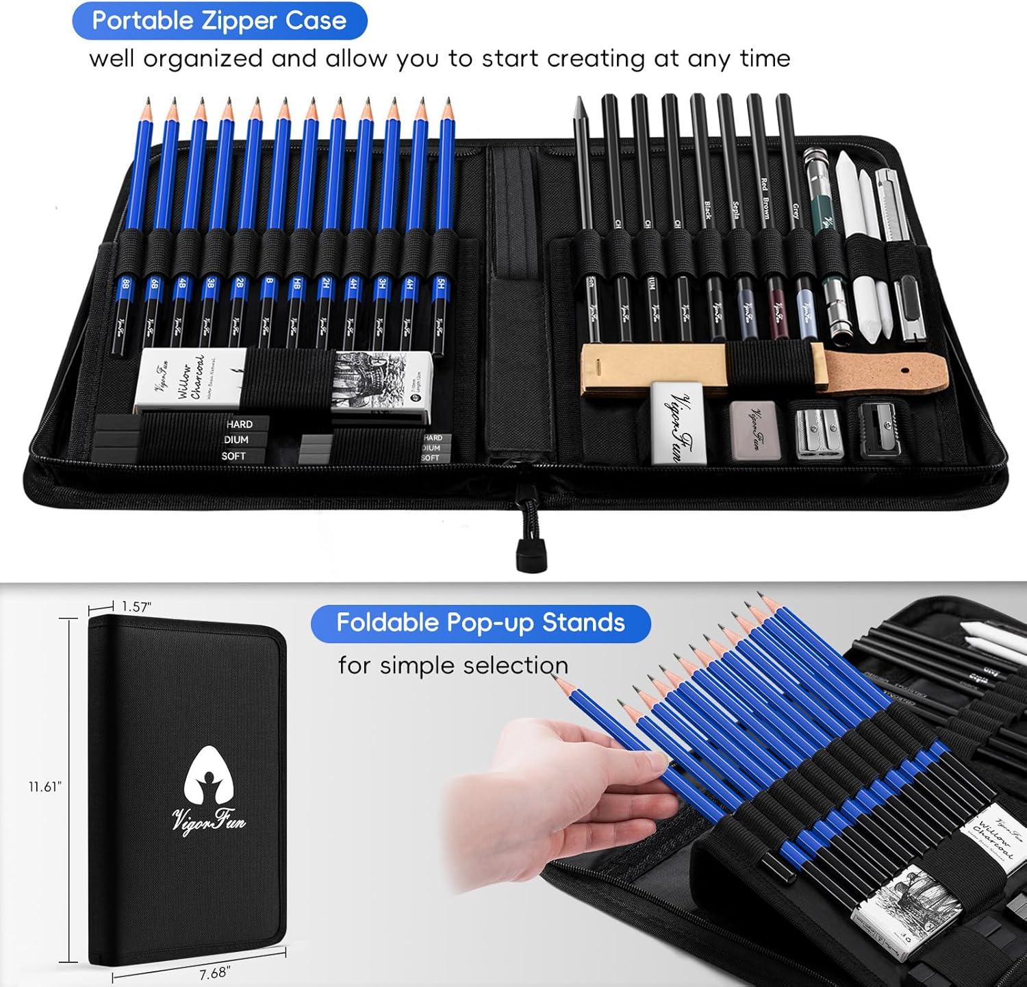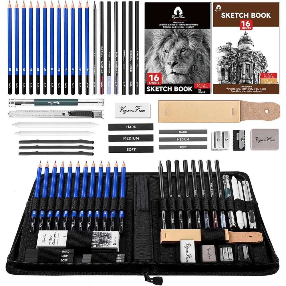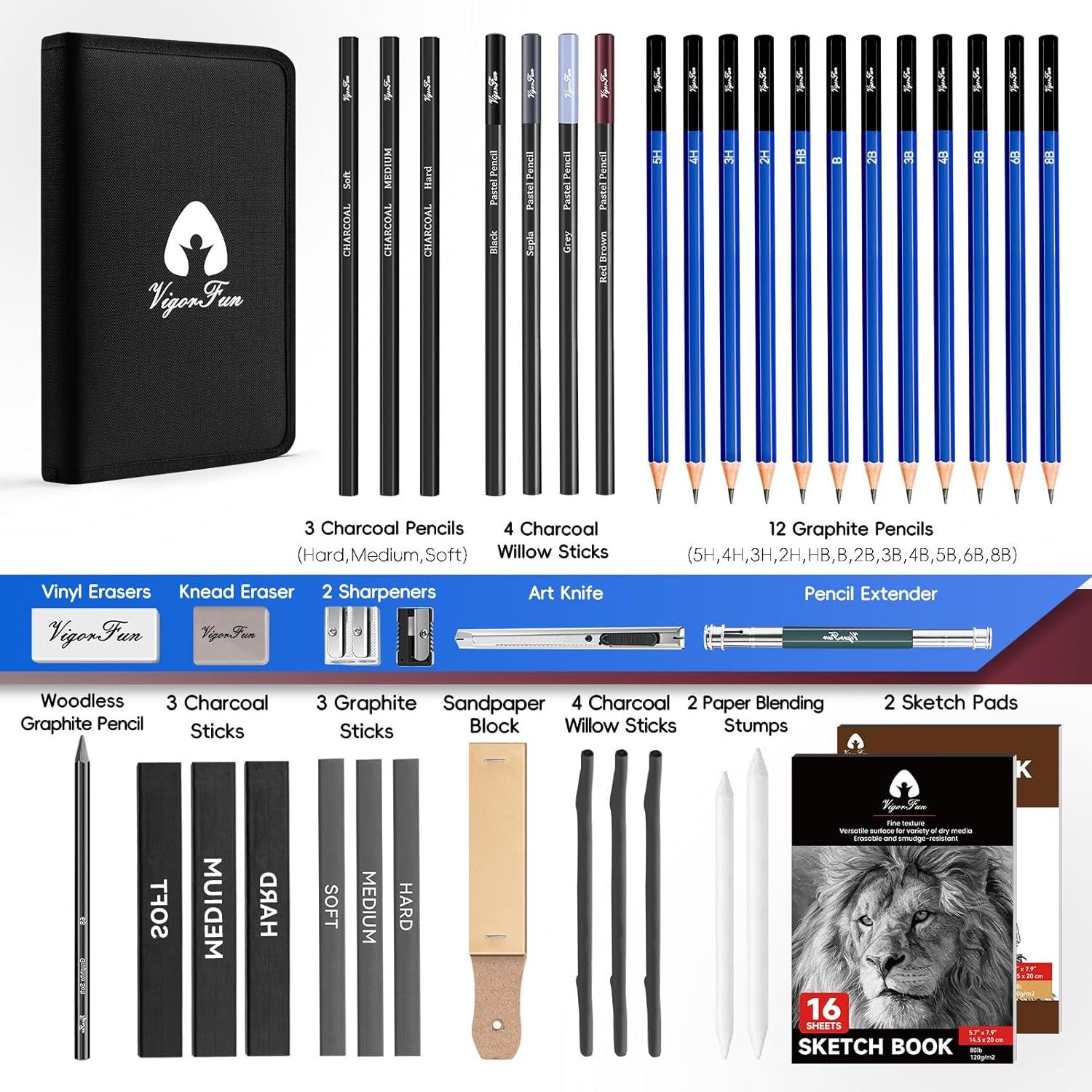 YOUR DRAWING KIT: This sketch set consists of 42 pieces art supplies, including 12 graphite pencils (2H,3H,4H,5H,HB,B,2B,3B,4B,5B,6B,8B), 1 graphite woodless pencil (6B), 3 charcoal pencils (Hard,Medium,Soft), 3 charcoal rods, 3 graphite rods, 4 charcoal willow sticks, 2 paper stumps, 2 erasers, 2 sharpeners, 4 pastel pencils, 1 pencil extender, 2 Sketch Pads and other drawing tools, all you need are in this portable art kit whether you are a professional or a beginner.