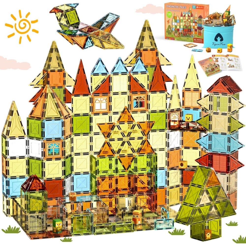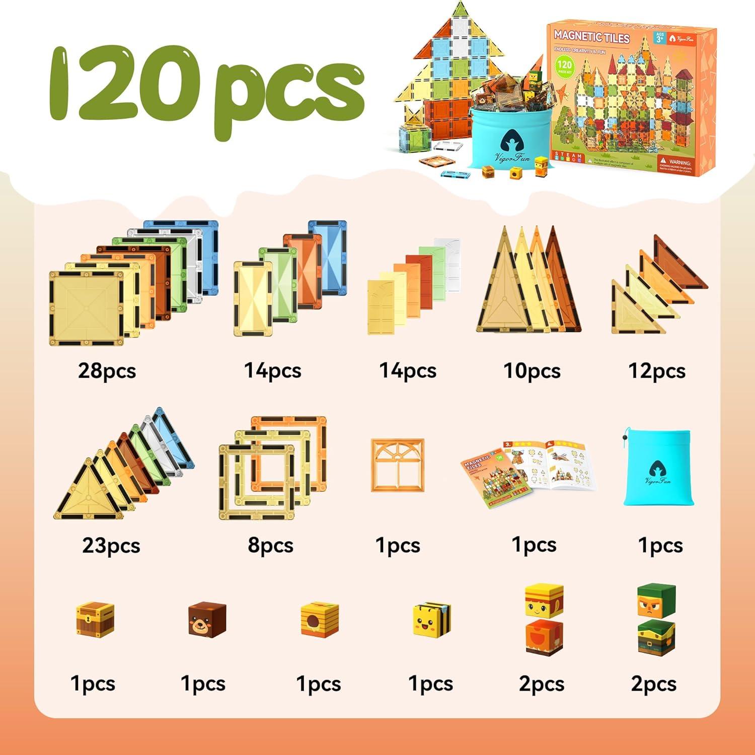 Deluxe Magnetic Tiles Set: Experience endless fun with our deluxe 120-piece magnetic tile toy set! This comprehensive collection features an abundance of earth tone magnetic tiles, along with 8 magnetic blocks, more accessories and a storage bag. With its diverse range of play accessories, this set provides exceptional value for money and is perfectly designed to entertain and engage kids for hours on end