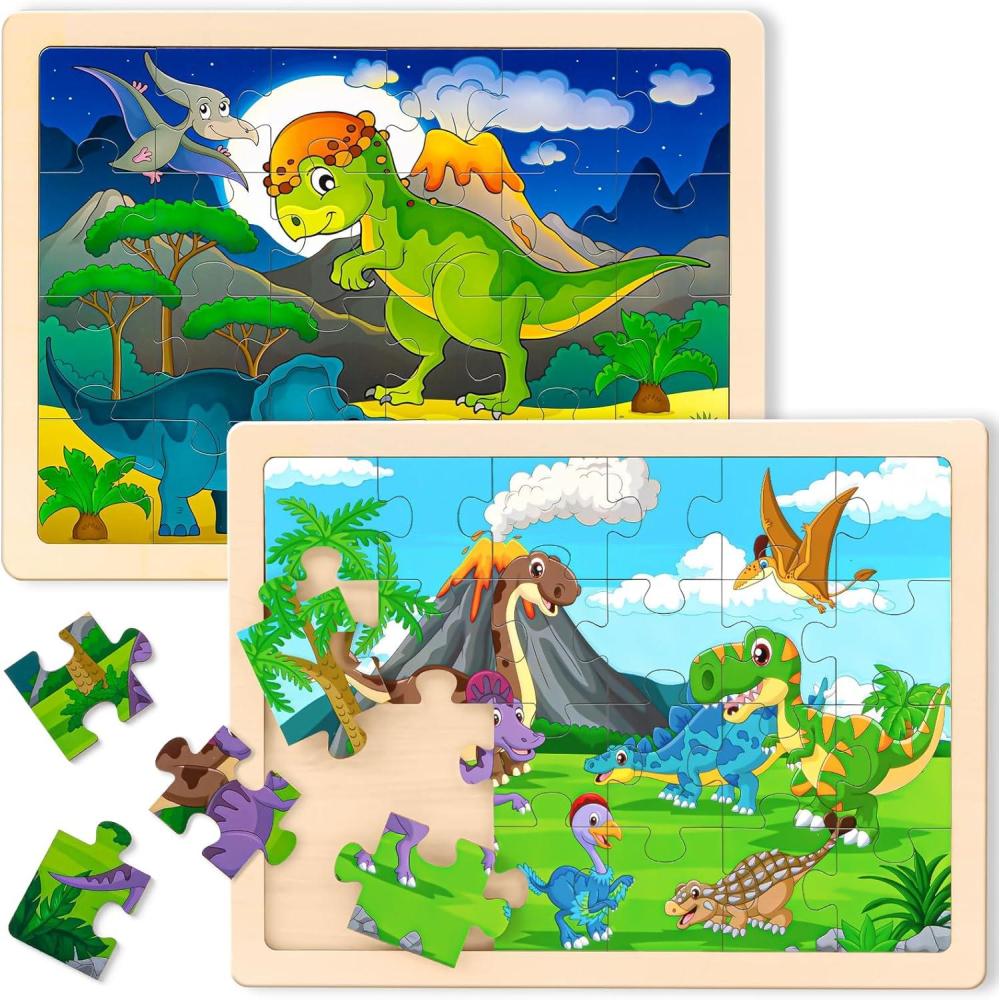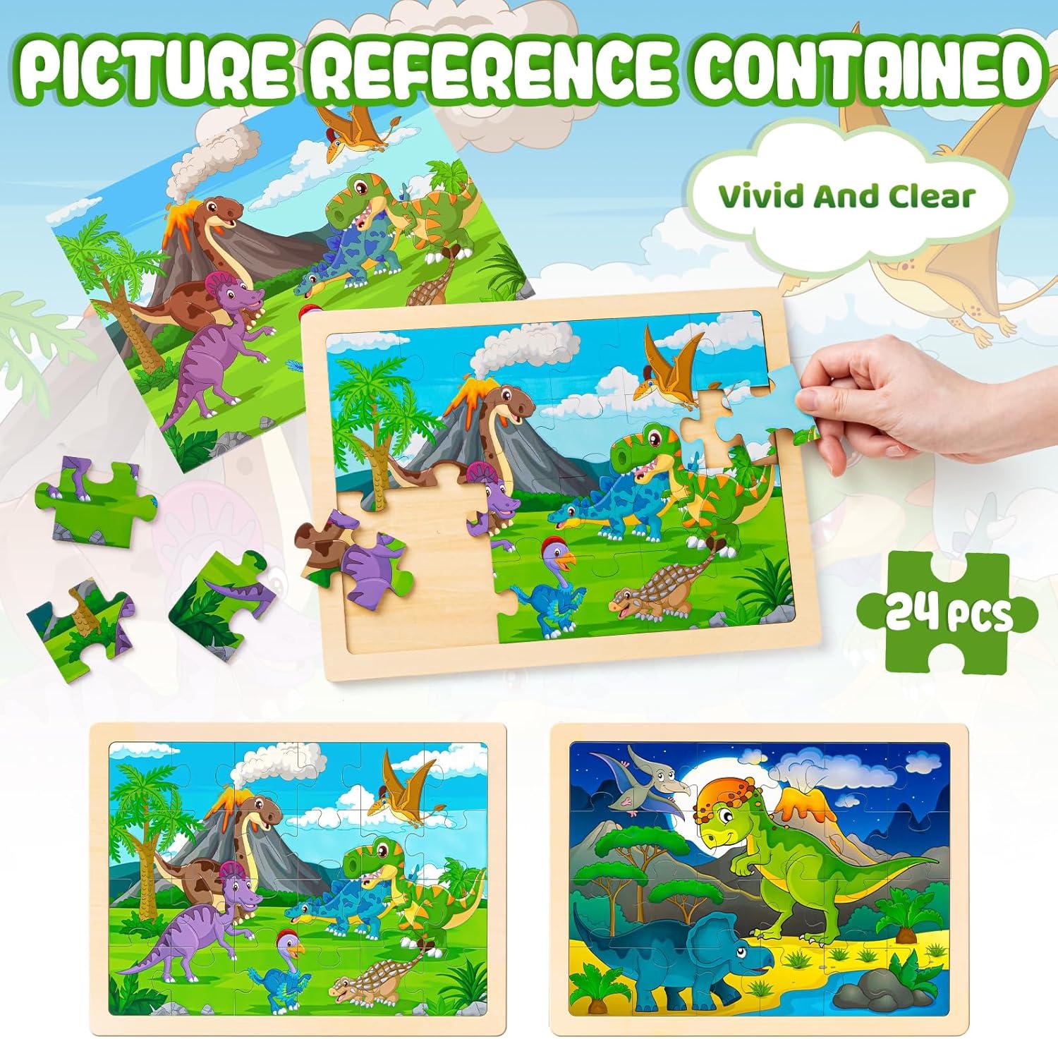 【Dinosaur Jigsaw Puzzles】Enter a world of excitement and discovery with our Dinosaur-Themed Jigsaw Puzzles. The wooden puzzles set contains 2 packs of 24 durable wooden jigsaw pieces and each piece reveals a unique dinosaur. These educational puzzle toys are more than just fun; they're a gateway to a realm of creativity and learning, special wooden puzzles for kids ages 3-5, offer an enriching experience that combines learning with play.
